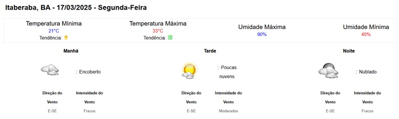Em Itaberaba, a previsão para segunda-feira (17) aponta temperaturas variando entre mínima de 21°C e máxima de 33°C, com céu encoberto pela manhã e poucas nuvens à tarde. Para terça-feira (18), espera-se mínima de 20°C e máxima de 34°C, com muitas nuvens pela manhã e baixa probabilidade de chuvas isoladas durante o dia.